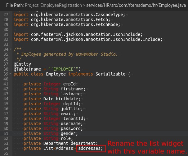 - Step-4: Create a model variable with Entry type and set the flag to the isList option and also the metadata same as the child entity(Address Entity present in the database) as shown in the image below.