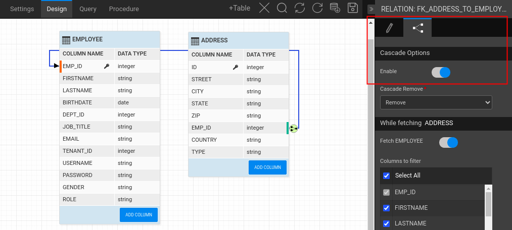 - Step-2: Enable the Cascade Option for the one-to-many relation as shown in the image below. For more information, see -->.