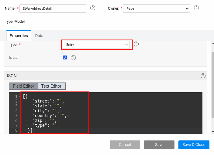 - Step-4: Create a model variable with Entry type and set the flag to the isList option and also the metadata same as the child entity(Address Entity present in the database) as shown in the image below.