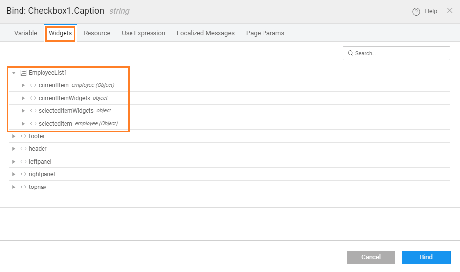 selecteditem & selectedItemWidgets: These bind objects can be used to capture the selected item of the list when selection is enabled for the List. The return type would be array in case of multi-select List. Both selecteditem and selectedItemWidgets can be accessed through the script as follows, the click of a button will capture the selected item firstname and the caption of widget Name: