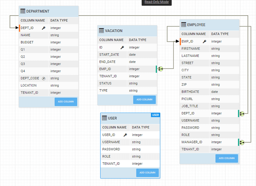 - Drag and drop a Data Table onto the third row of the Grid. Set the data source of the Data Table to the selected item of the chart widget. Choose the other settings as per your requirements. We have chosen a Read-only table and selected to display department id, name, budget, code, and location.
