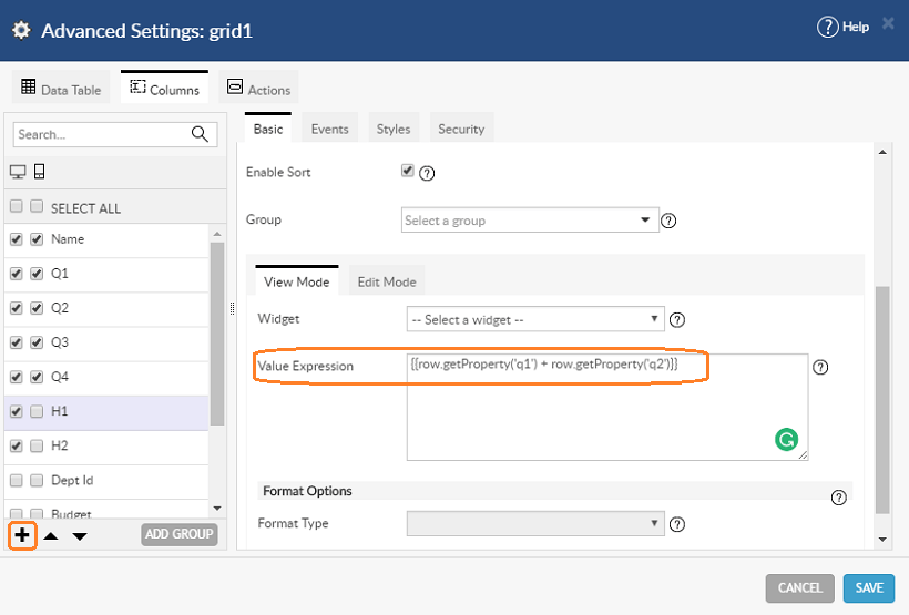 You can combine two or more columns to be displayed in a single column in a Data Table. Use Case: From the Department table, display two half-yearly budget figures by adding the values for first two and the second two quarters. We will be using the hrdb that is shipped with WaveMaker.