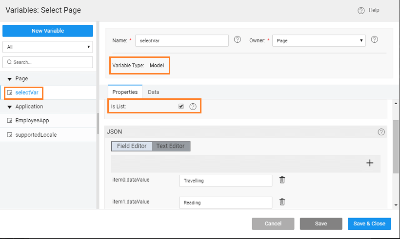 4. Set the Data field value to the dataValue of the model variable. This is the value that is selected by the user.