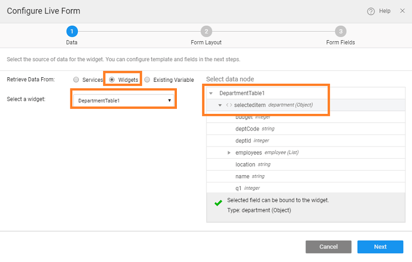 The form field can be bind to any other variable. Note that datafield should be set as ‘All Fields’. As this is a foreign key, it expects an object. Here we have changed the binding to the Live Variable for Employee table and the display field has been set to lastname.