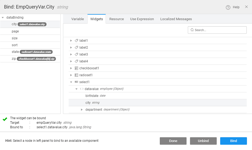 Bind variable data city, state and zip to the selected values of Select, Checkboxset and Radioset widgets.