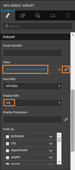 - Select: bind it to the Employee - Set the datafield property to city and display field also to city. The display field is the value that the user sees while the datafield is the value that is internally represents the display value. In this case both are the same.
