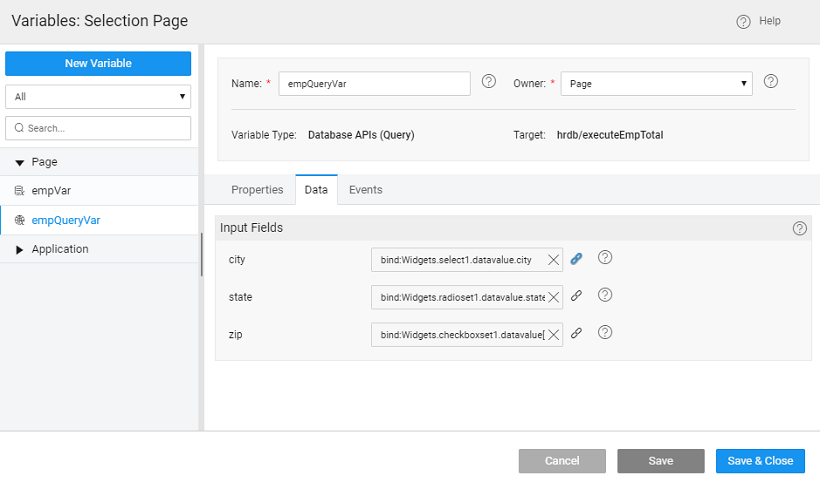 Bind variable data city, state and zip to the selected values of Select, Checkboxset and Radioset widgets.