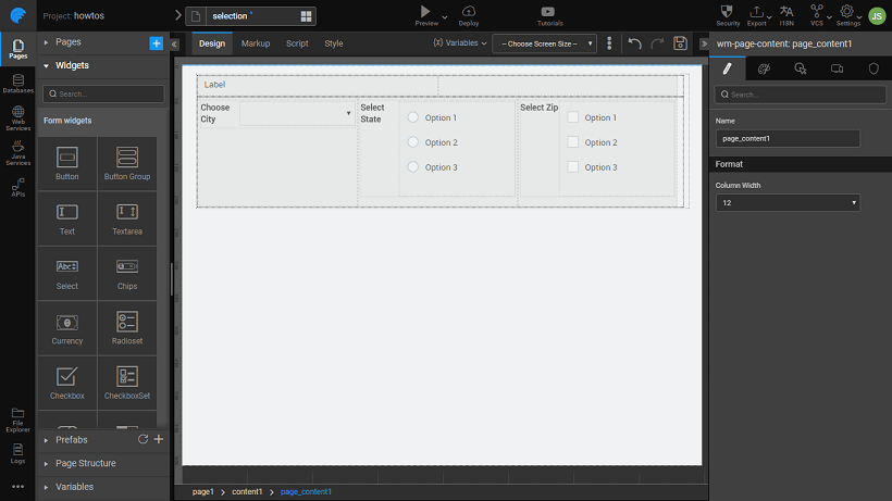 Drag and drop a Select, Radioset, Checkboxset and a Label widget onto the canvas.