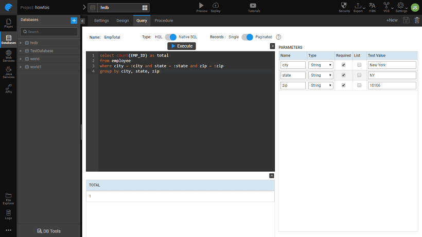 select count(EMP_ID) as total from employee where city = :city and state = :state and zip = :zip group by city, state, zip