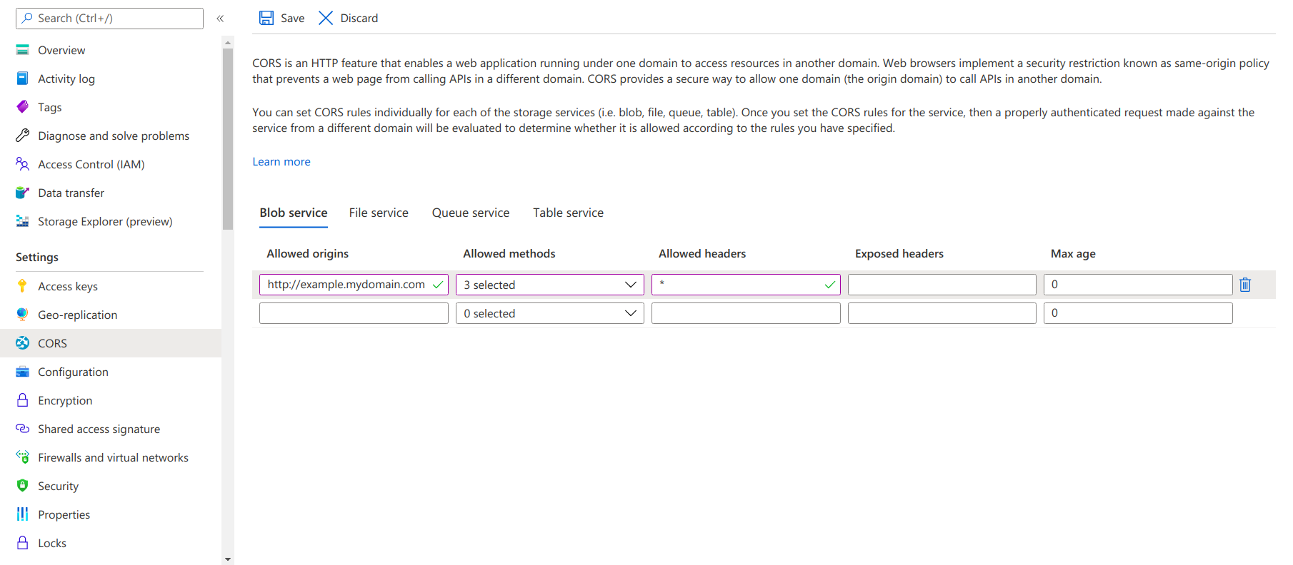 Enable CORS If the web application is loaded in one domain and the frontend code in the Azure storage container is loaded with a different CDN domain.In the Azure storage account select CORS under settings to enable.