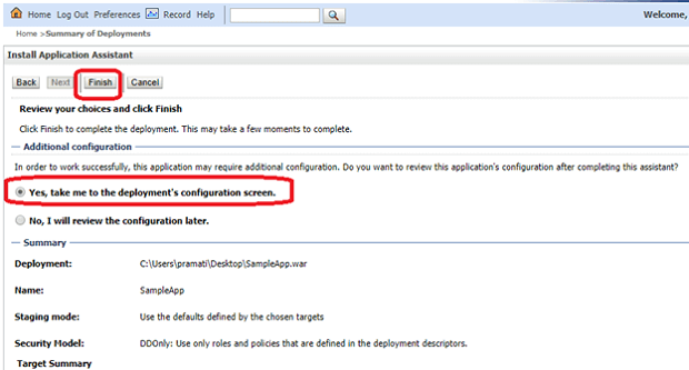 Select 'Yes, take me to the deployment's configuration screen' and click the Finish button.