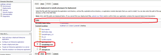 Provide the path to the location of war file in the Path text box, select the war file and click the Next button.