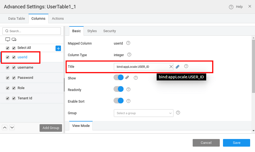 - The column names need to be added in the localization i.e., i18n dialog as message keys