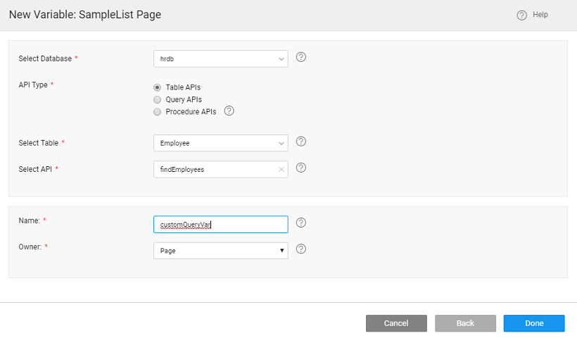 - Create a Database API Variable named customQueryVar for the page created in previous step and set