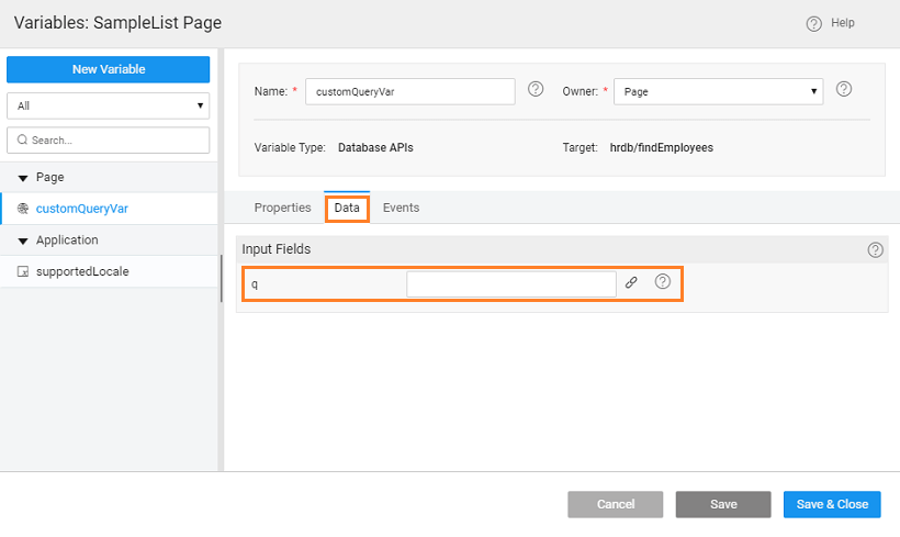 - Notice in Data tab of the Service Variable q Input Field. This will be used to construct the dynamic where clause on Employee for findEmployees method.