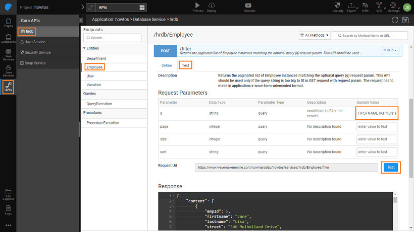 From the API Designer, select Employee Entity under HRDB and select POST / filter api - Returns the list of Employee instances matching the search criteria.