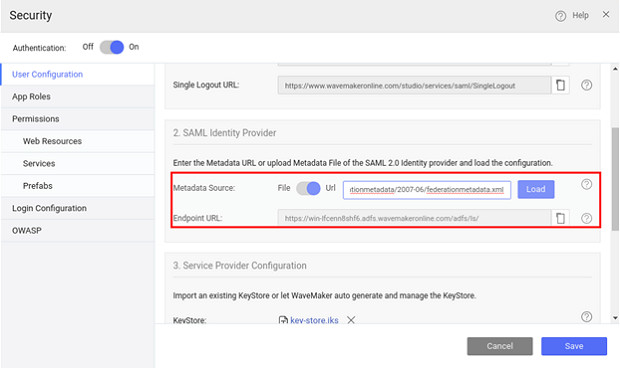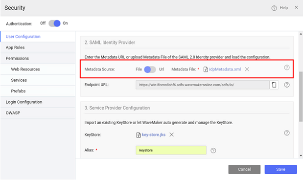 2. Configure ADFS Federation Metadata details in WaveMaker App. You can either use the URL or upload file.