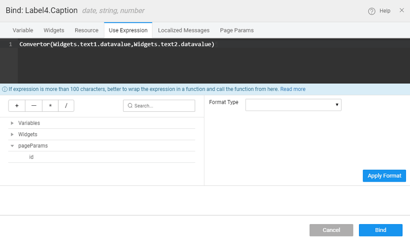 • Instead of the button click event, you can invoke the JS function from the Use Expression option of the bind dialog for the Label caption property: