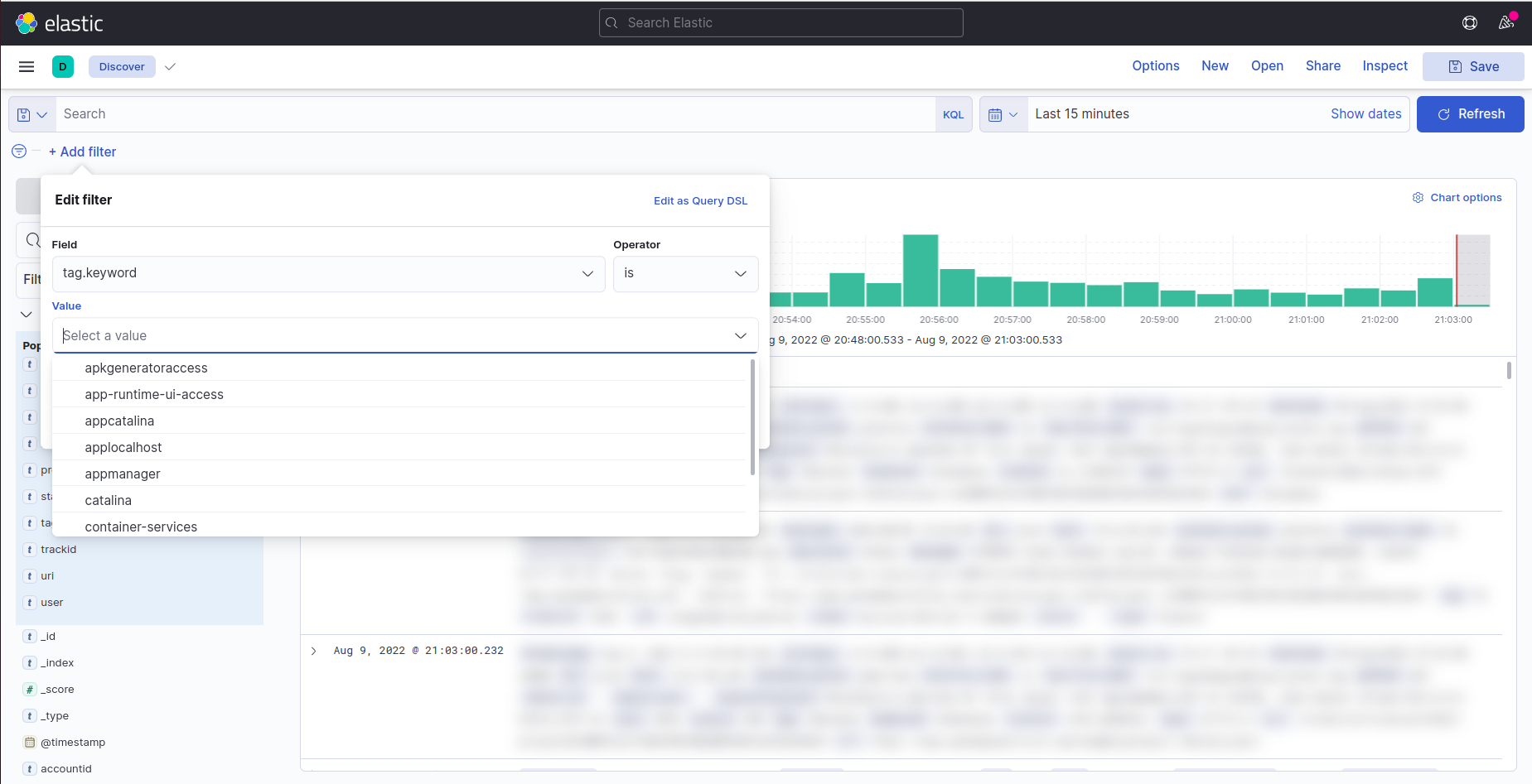 - In the Kibana's Discover page, click the "Add a filter" button on the top left.