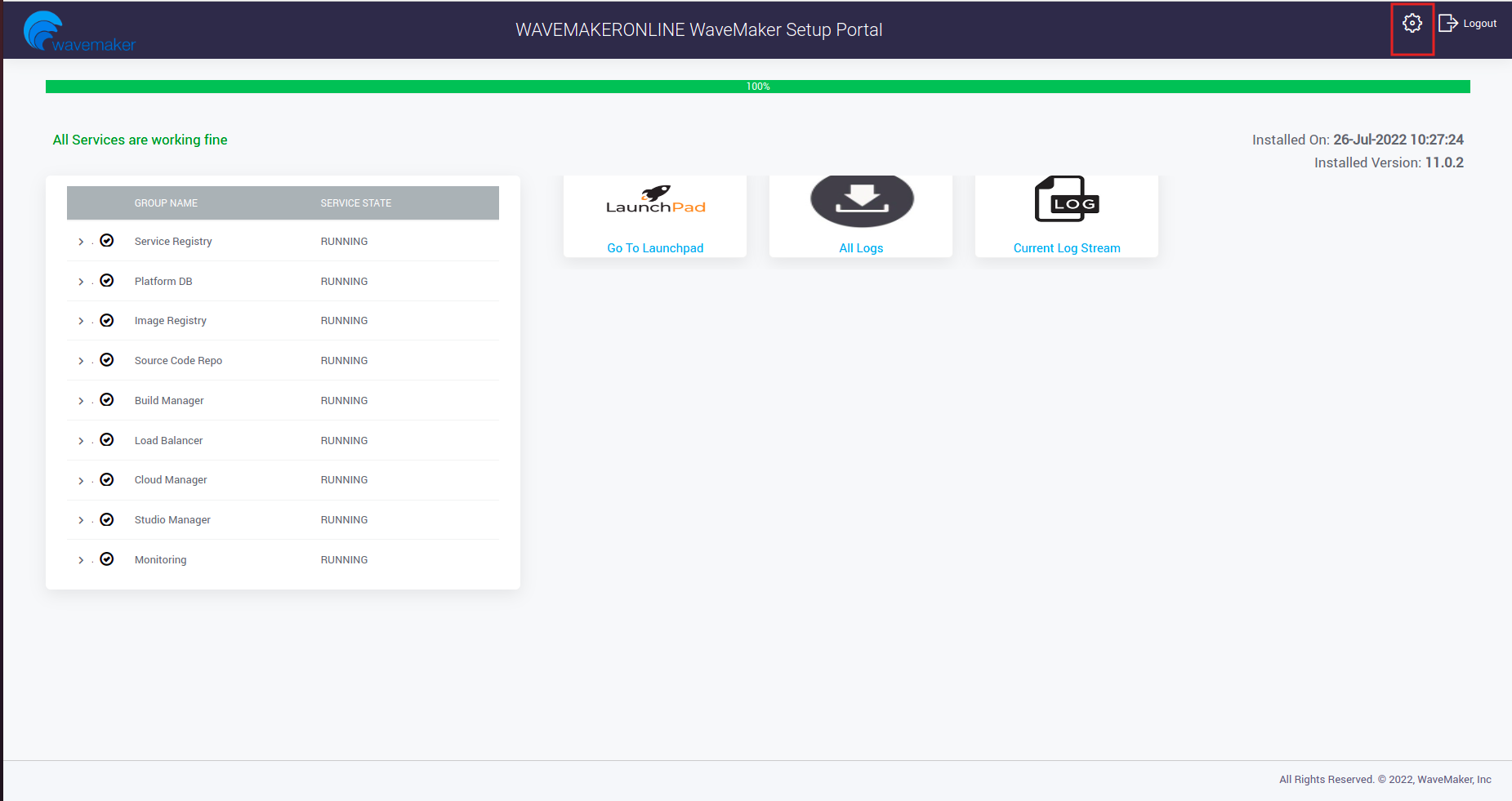 - After rebooting the platform Instance, the config wizard will automatically start the WME setup, you can verify the startup process through CW portal and can use the setup post start up process.