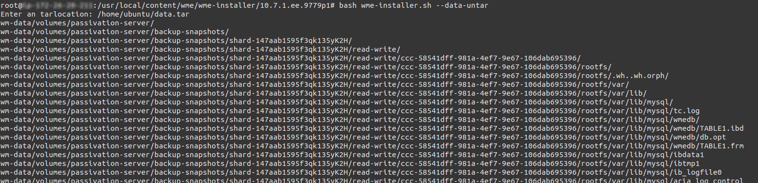 - Copy the generated data.tar to secure location either on to new WME Platform Instance or to any cloud storage services or your local machine. This data.tar will be used for restoring purposes.