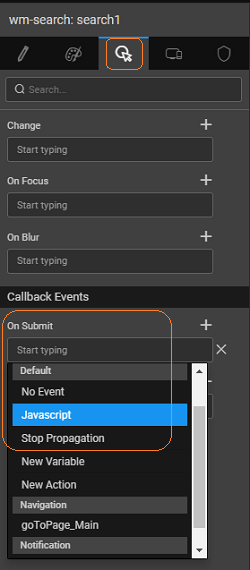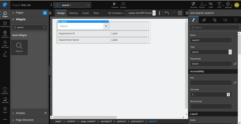 WaveMaker allows you to add search capability via the search widget. Following are the steps in using the same. We will use the search widget to search the --> and display the department id and name.