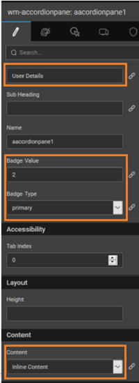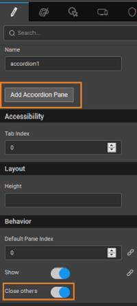 | Name | The name is a unique identifier for the accordion pane. Special characters and spaces are not allowed in widget name. |