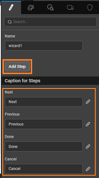 Next and Previous: To navigate through the steps of the wizard we have Next and Previous buttons in the wizard widget. The caption for these buttons can be changed using the Next caption and Previous caption properties available in the Wizard basic properties. The captions are also bindable.