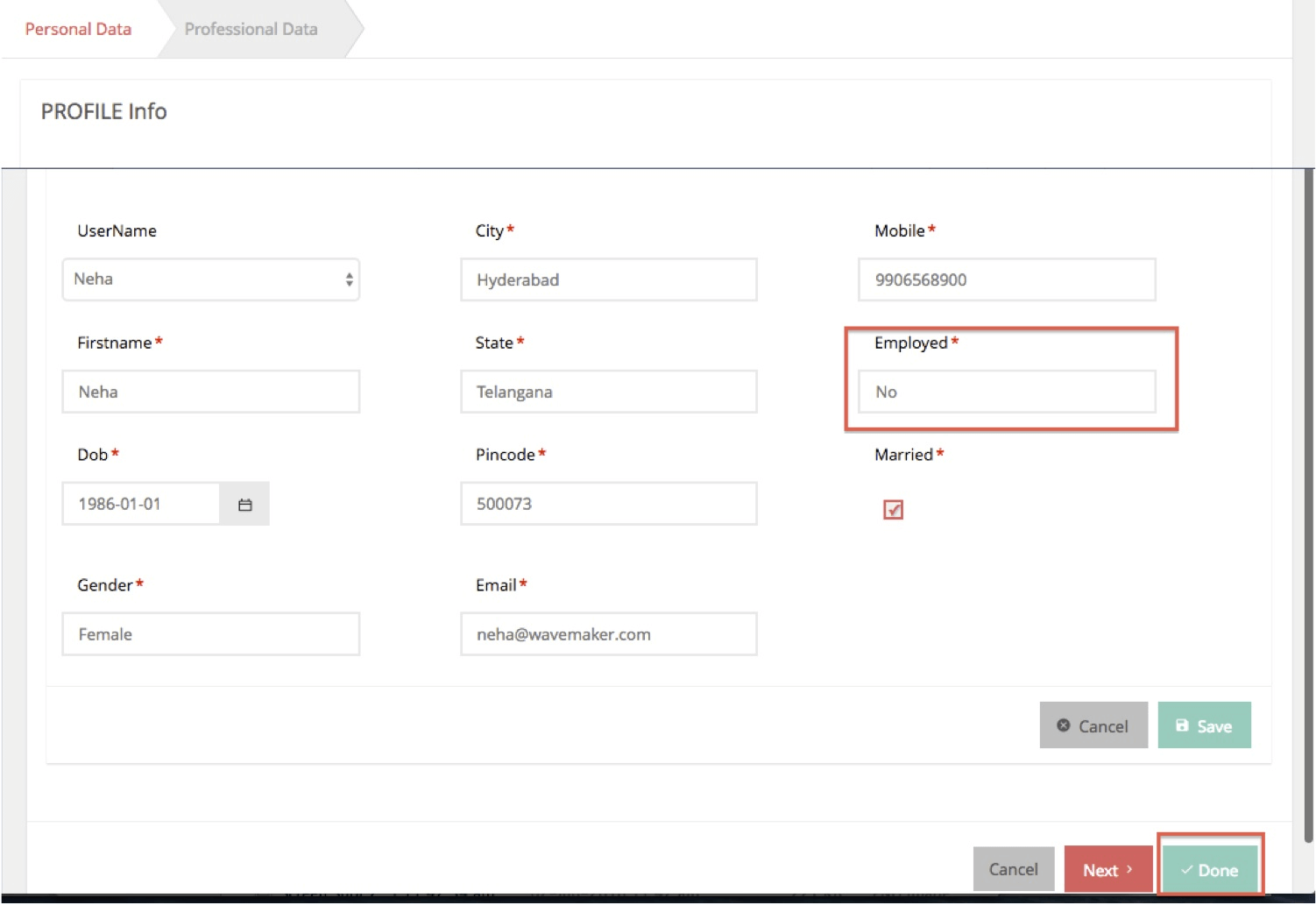 - On Done: Use Case –When the User is Employed. In this case, the user is allowed to move to the next step to enter professional data. Once entered and Done button is clicked, On Done event fires. A JavaScript handler is added to On Done Event which does the following: