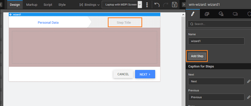 - WaveMaker Wizard widget has one step by default and user can add multiple steps using the Wizard Add Step property.