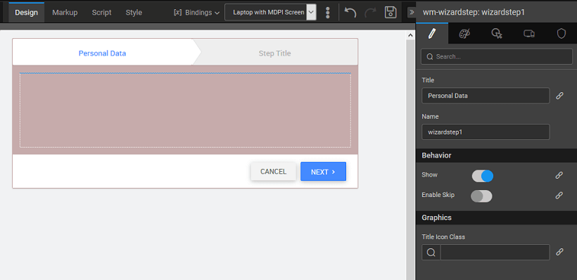 - Content: The content can only be an inline content which means that you have to design each step of the wizard like you design every page in WaveMaker. You cannot use partial content in any step of the wizard.