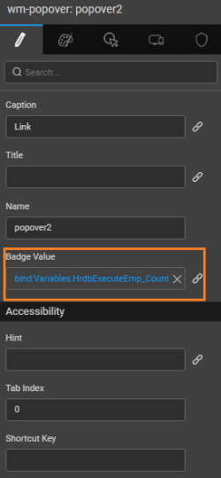 1. Set the content source property to the partial and the content as popover page created in the previous step and bind the badge value to the Emp_Count value. Content defines the page to be displayed when the popover link is clicked and badge indicates the number of items that will be displayed in the content.