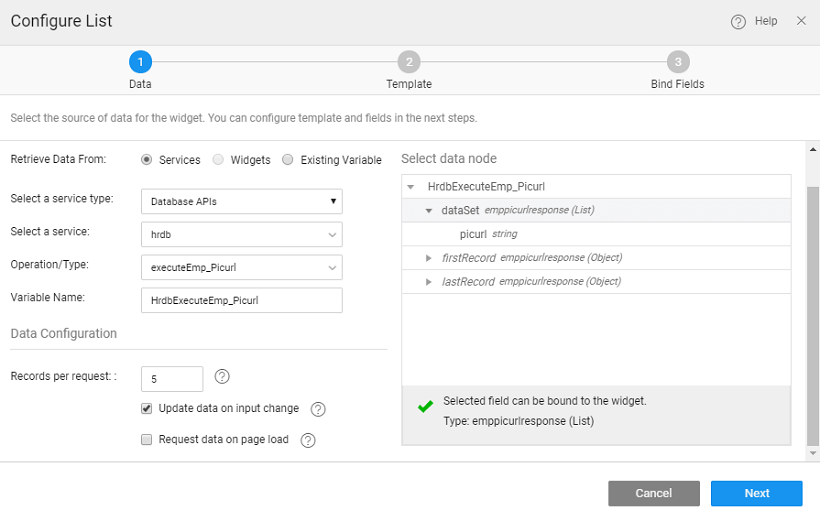 • Drag and drop a List onto the canvas space, select the data source to the dataset of the Emp_Picurl query variable created in the first step and set the layout to Media List.
