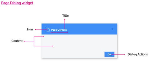 Page Dialog is a popup window that displays page content and can be dismissed by the user. The content property of this widget can be set to the desired --> content.